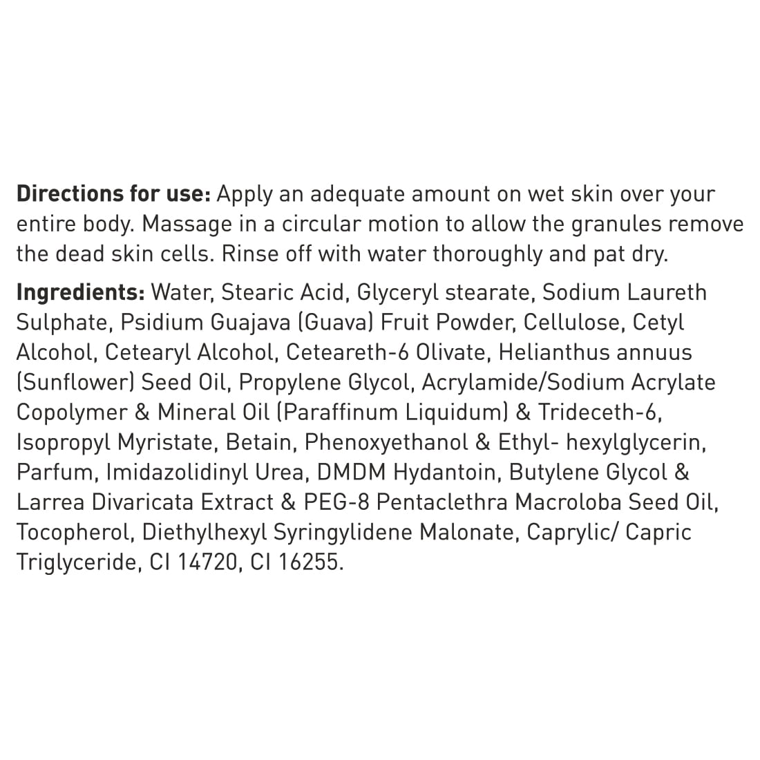 Apply an adequate amount on wet skin over your entire body. Massage in a circular motion to allow the granules remove the dead skin cells. Rinse off with water thoroughly and pat dry.