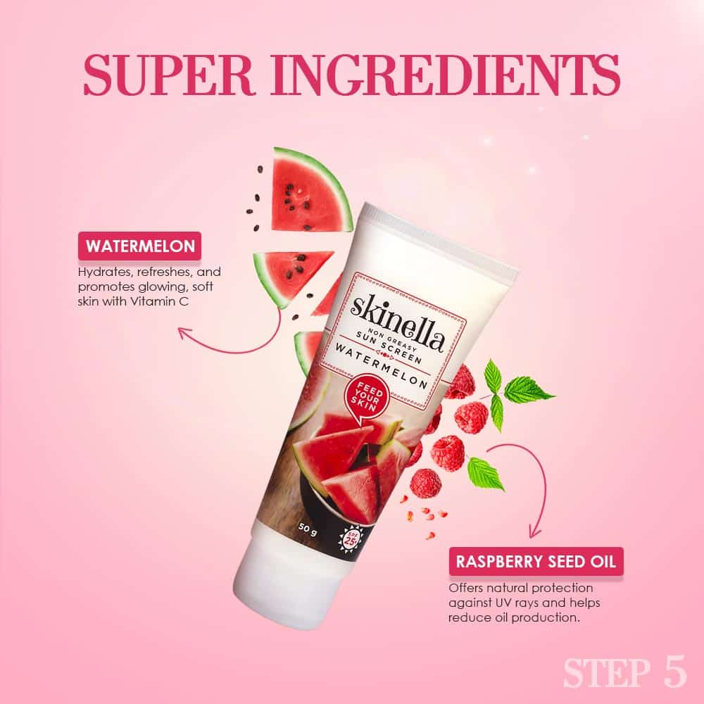 Watermelon Sunscreen SPF 25+ – Lightweight, non-greasy protection with watermelon and raspberry seed oil to shield against UV rays while keeping skin soft, smooth, and hydrated.