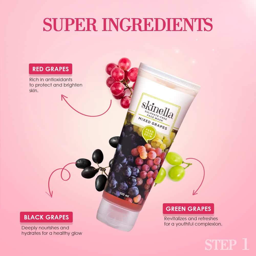 Mixed Grapes Sulphate-Free Face Wash: A gentle, sulphate-free cleanser packed with grapes to remove impurities while keeping skin soft and hydrated.