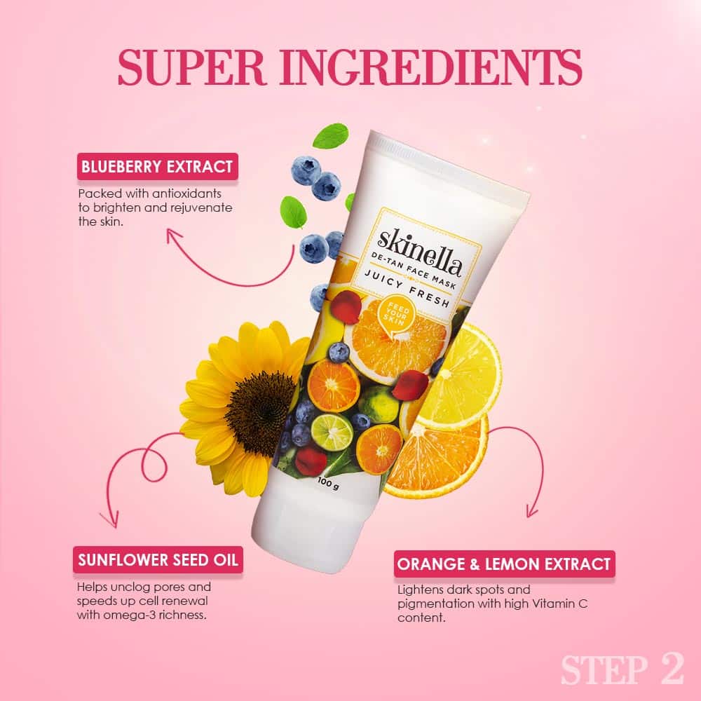 Juicy Fresh De-Tan Mask: A refreshing mask infused with citrus extracts to lighten tan, brighten skin, and provide a healthy glow.