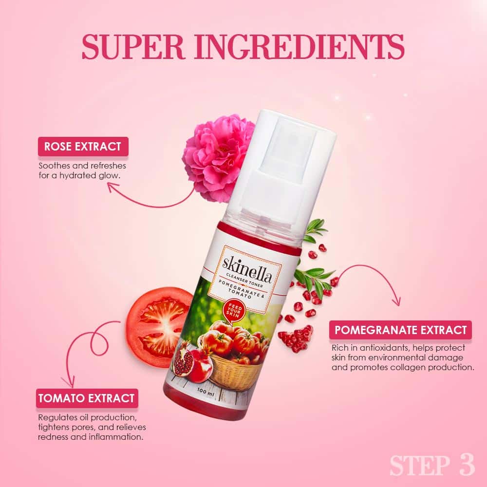 Pomegranate & Tomato Cleanser Toner: A revitalizing toner with pomegranate and tomato to tighten pores, reduce dullness, and refresh the skin.