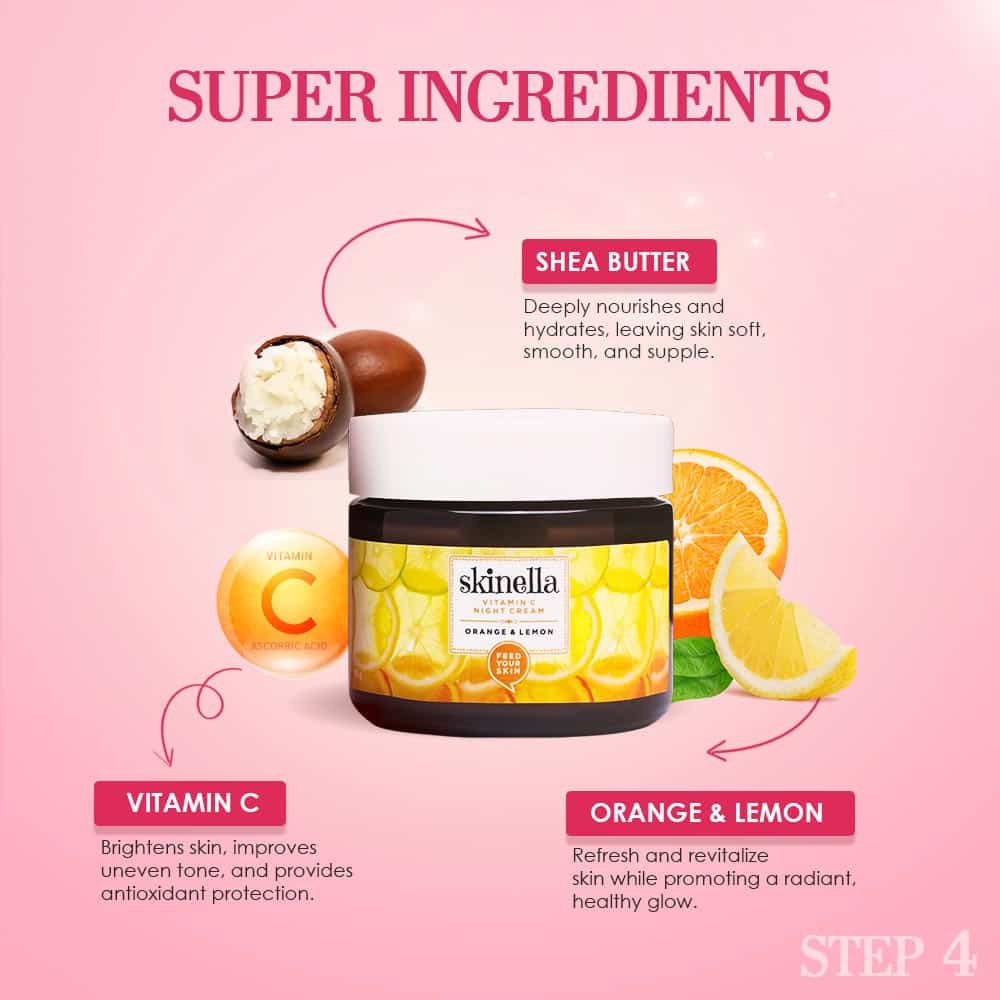 Vitamin C Orange & Lemon Night Cream: A deeply nourishing night cream enriched with Vitamin C from oranges and lemons to boost radiance and repair skin overnight.