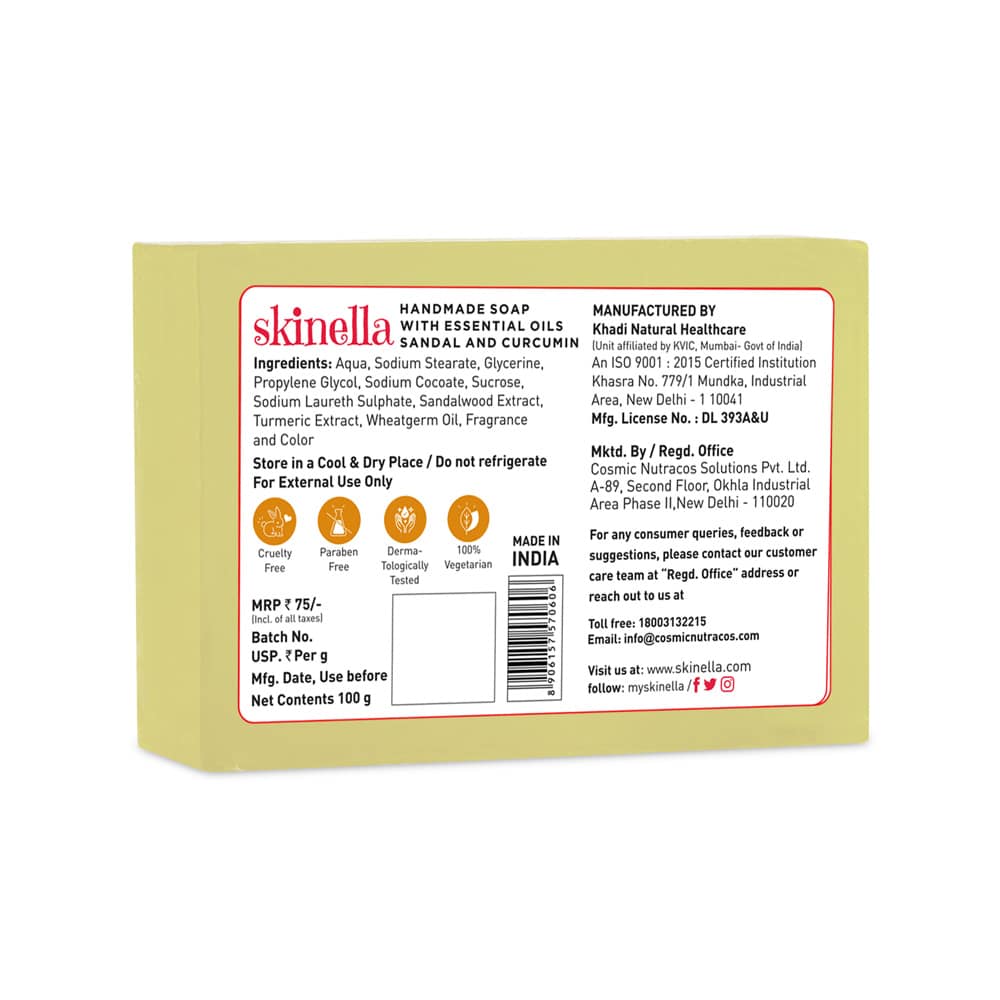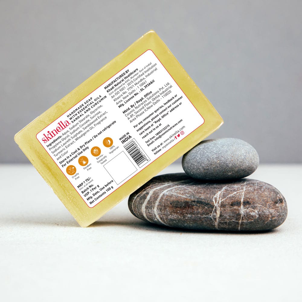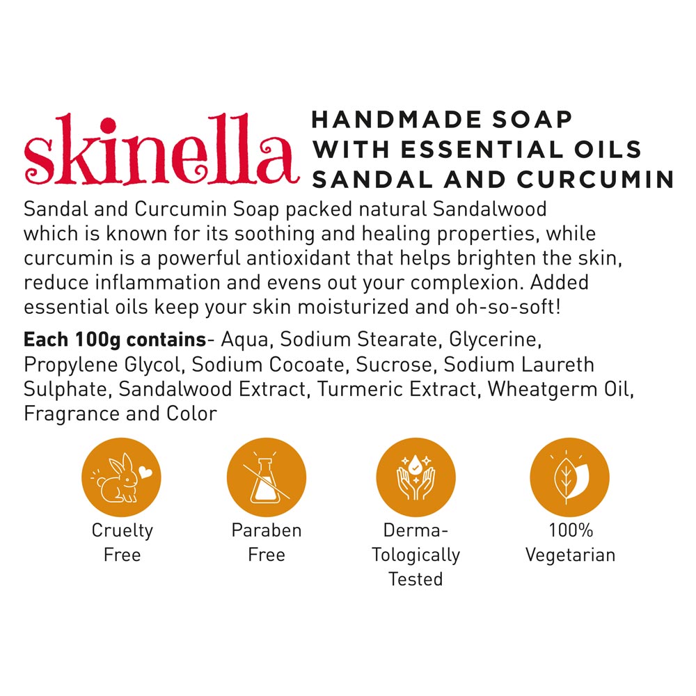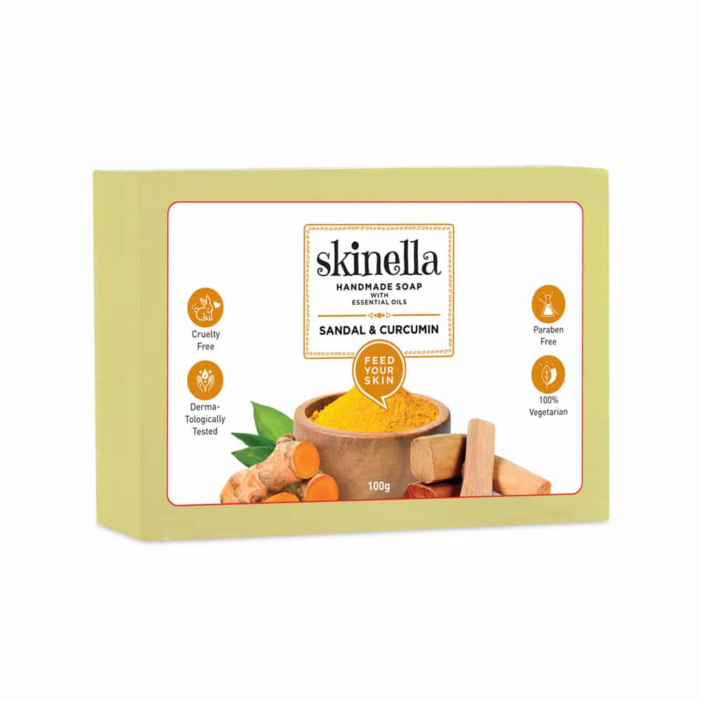 Skinella’s Sandal & Curcumin Soap has been crafted for daily usage. Wet it slightly in water and use it on your arms, legs, back, stomach, shoulders, and neck while showering. For best results, use it morning and night.