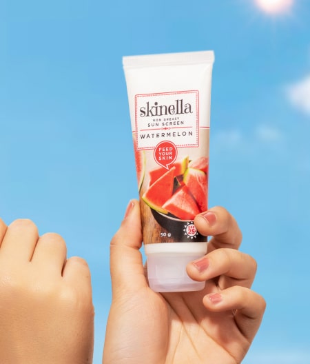 It’s time to live life sunny-side up! Powered with naturally nourishing superfoods like watermelon and raspberry seed oil, Skinella’s Watermelon Sun Screen offers 25+ SPF, protection against UV rays, and a non-greasy formula that’s ideal for everyday usage. Watermelon brings the superpowers of Vitamin C, resulting in softer, smoother, glowing skin. The cooling fruit also helps reduce pore size and regulate oil production; aromatic raspberry seed oil offers natural protection against harmful UV rays. Suitable for all skin types, our superfood-packed sun screen is handy for days running errands out in the sun, a sunlit picnic, or a beachy holiday! Just carry a bottle in your bag and reapply as needed, throughout the day. Go out and have some fun in the sun!
